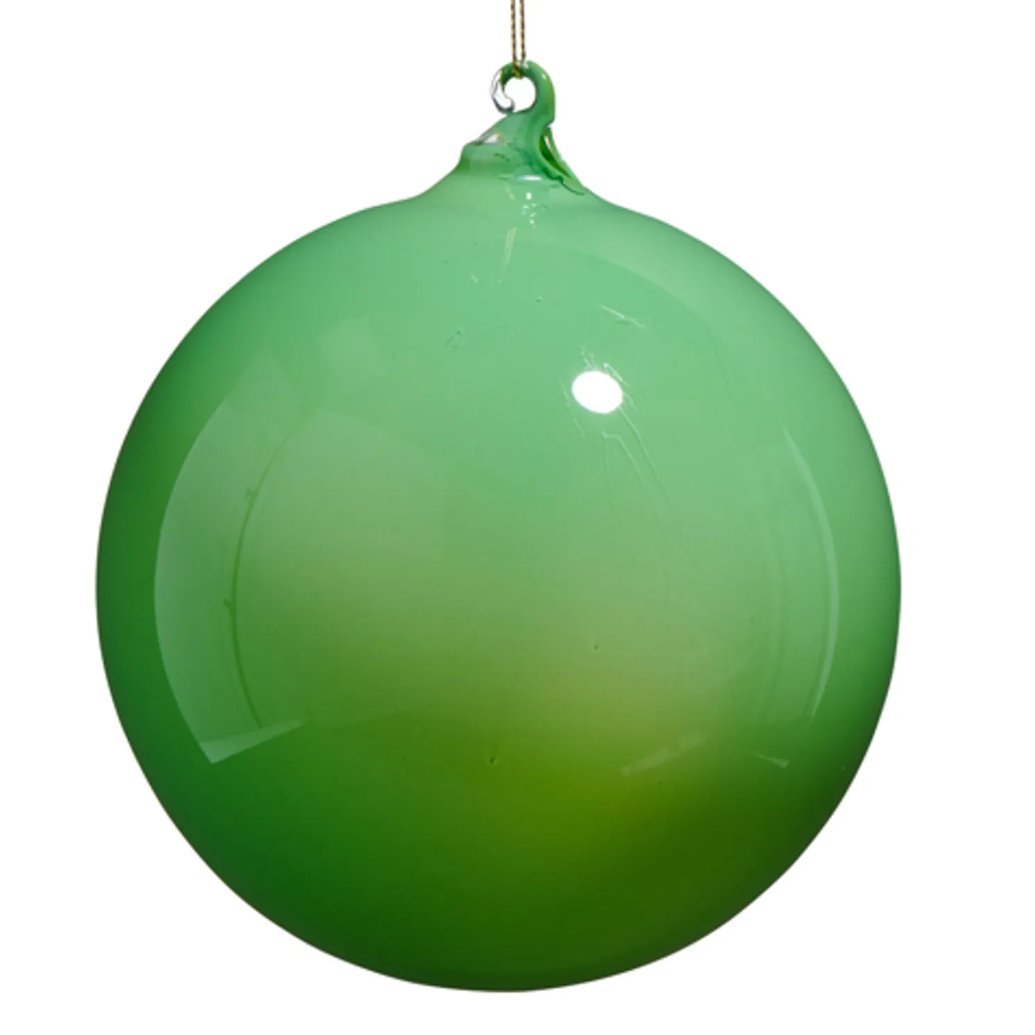 Decorate your tree, wreath, or garland with this stunning green ball ornament! They easily fill in empty spots and add pops of color!Made by Raz Imports.Made of glass.Dimensions: 5″.