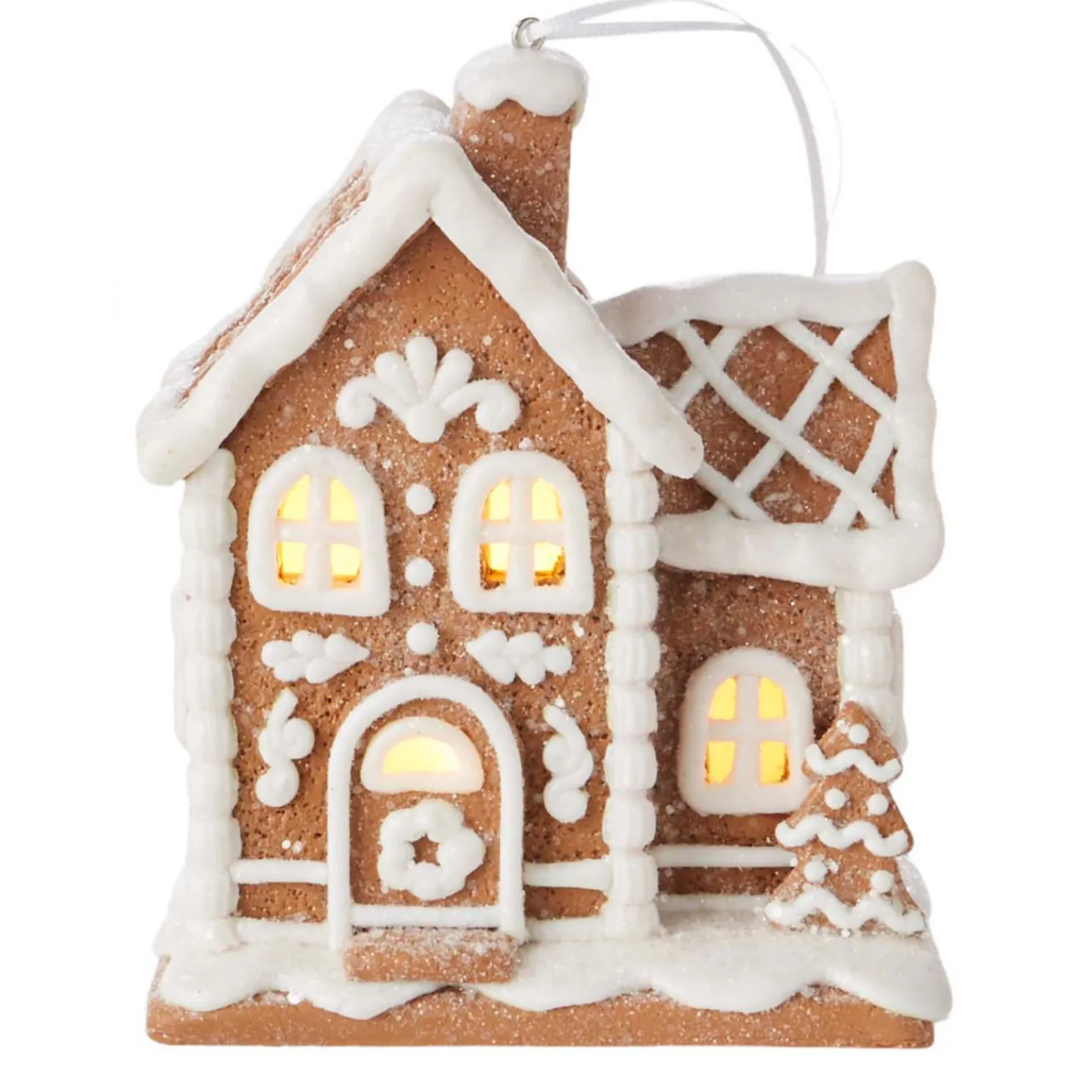 Merry Christmas! Sweeten up your Christmas tree with these adorable gingerbread house ornaments! Each one is made of a warm brown color with bright white icing detail and tiny gingerbread trees with a warm glow coming from the windows! Each sold individually.Includes 3 Lr44 Batteries.6 Hour Timer Repeats Every 18 Hours.Made by Raz Imports.Made of claydough.Dimensions:4″L X 3.75″W X 5″H.Item #: 4216130