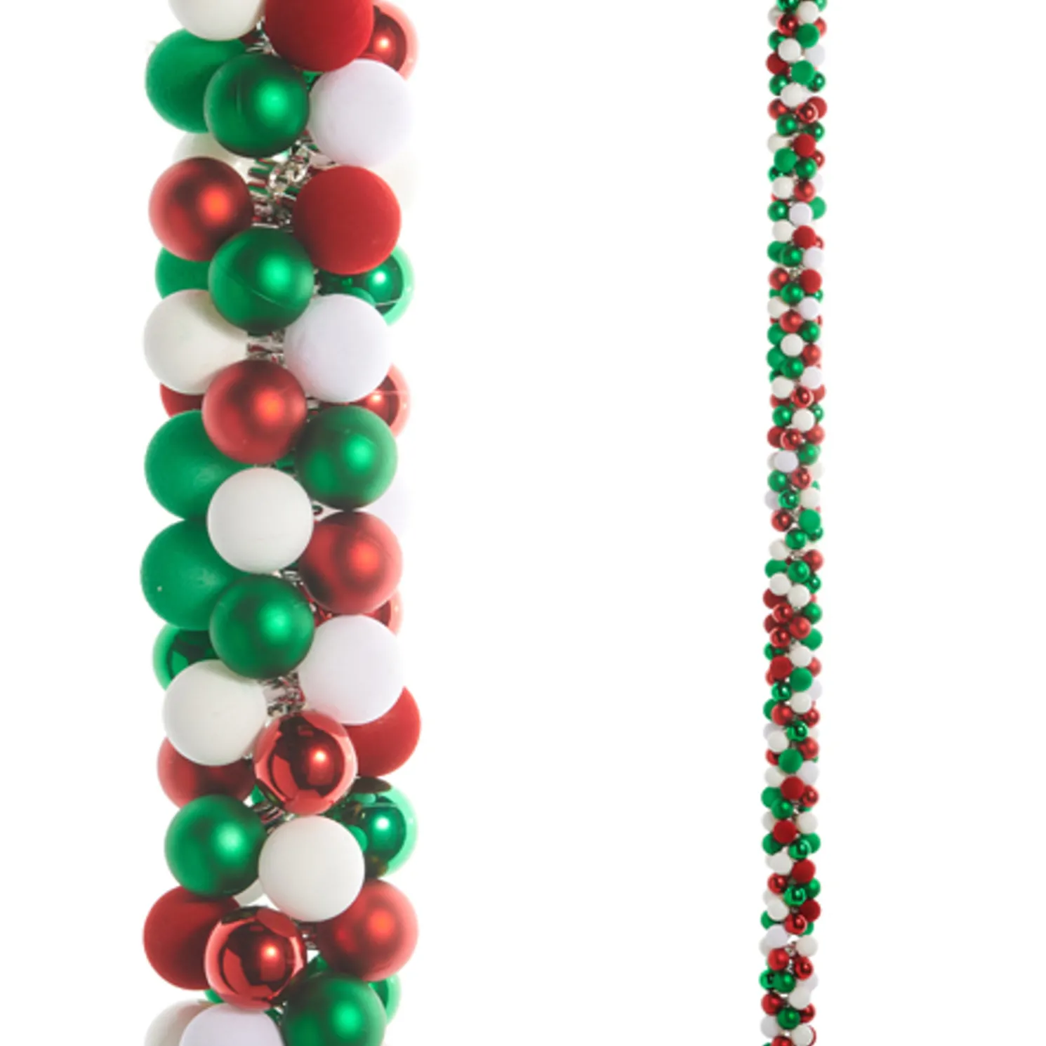 This tight knit red, white, and green ball ornament garland will make a statement on al tree this year or it can be used to decorate the stair banister!Made by Raz Imports.Made of plastic.Dimensions: 5′.