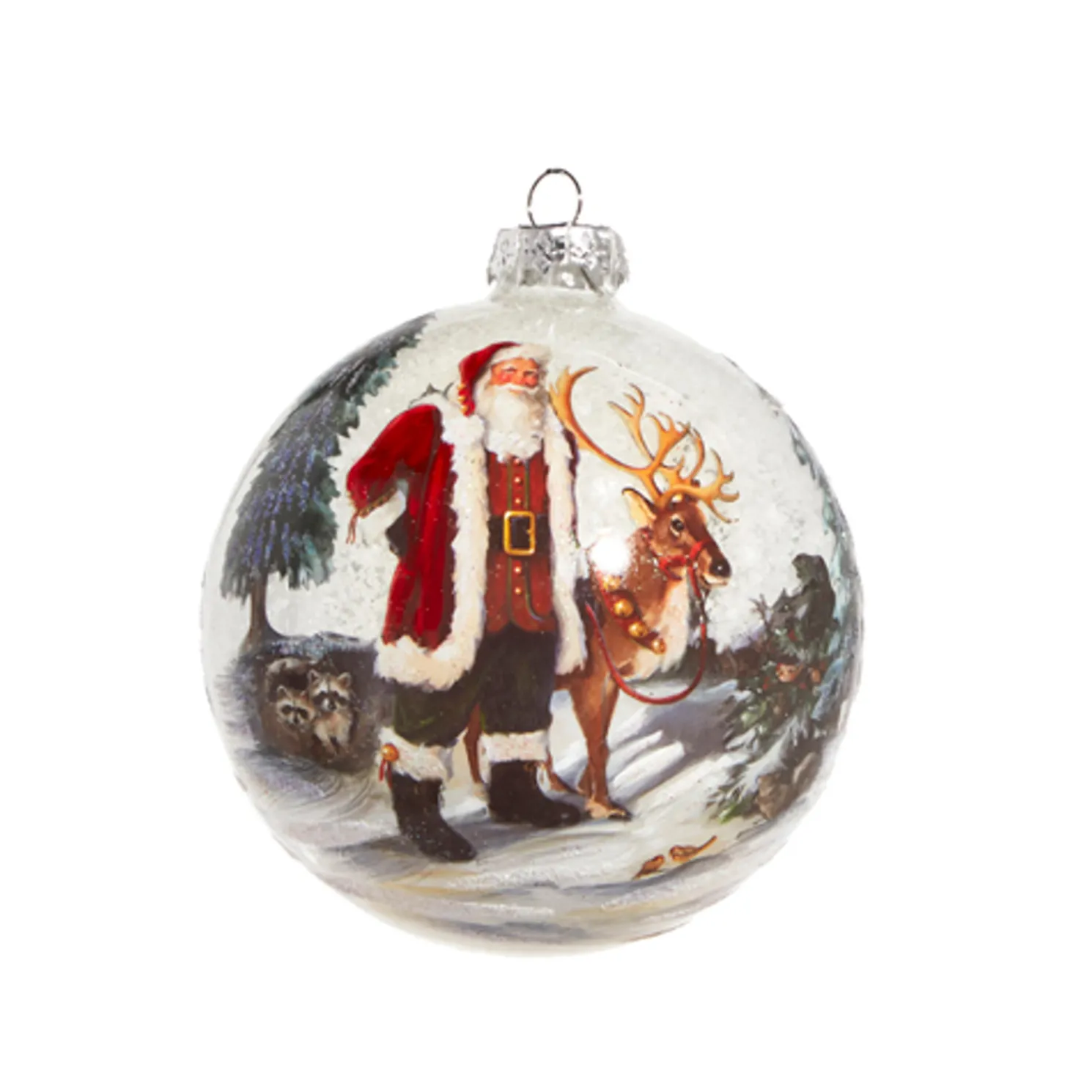 Santa takes a minute to stroll through the woods to see his furry friends! This ornament features a pretty white, snowy scene dotted withsmall animal friends!Made by Raz Imports.Made of glass.Dimensions: 5″.