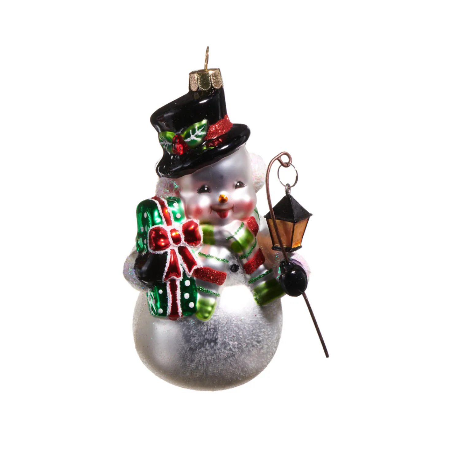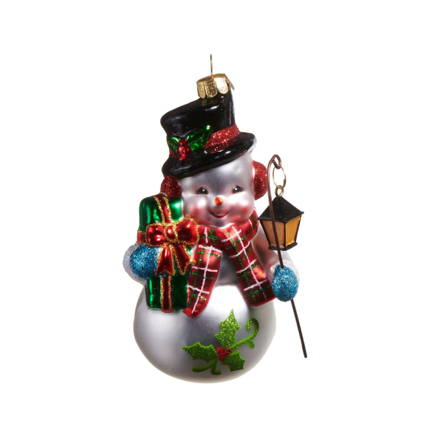 Ornaments simply don’t get any cuter than these guys! Featuring smiling snowmen dressed in glittered scarfs and black top hats while holding onto beautifully wrapped gifts and a lantern to light their way!Each sold individually.Made by Raz Imports.Made of glass and resin.Dimensions:3″L X 2.5″W X 5″H.