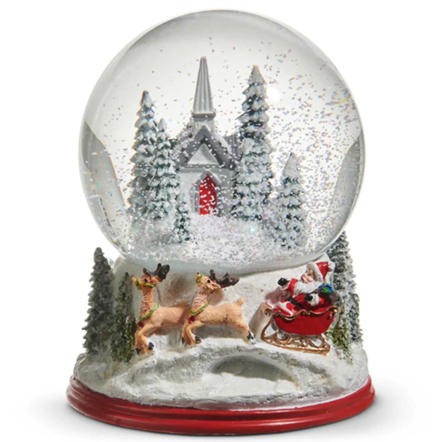 This enchanting snow globe features a stunning white church with bright red doors, surrounded by tall snow-covered trees and swirling flakes of snow. The base is sculpted like a snowy hillside with fluffy trees, while Santa soars above on Christmas Eve to deliver toys. A beautiful keepsake for your mantel, side table, or entryway, this snow globe also makes a charming gift for collectors and holiday décor lovers.Wind Up,Plays “Deck the Halls”.Made by Raz Imports.Made of resin and glass.Item #: 4516289