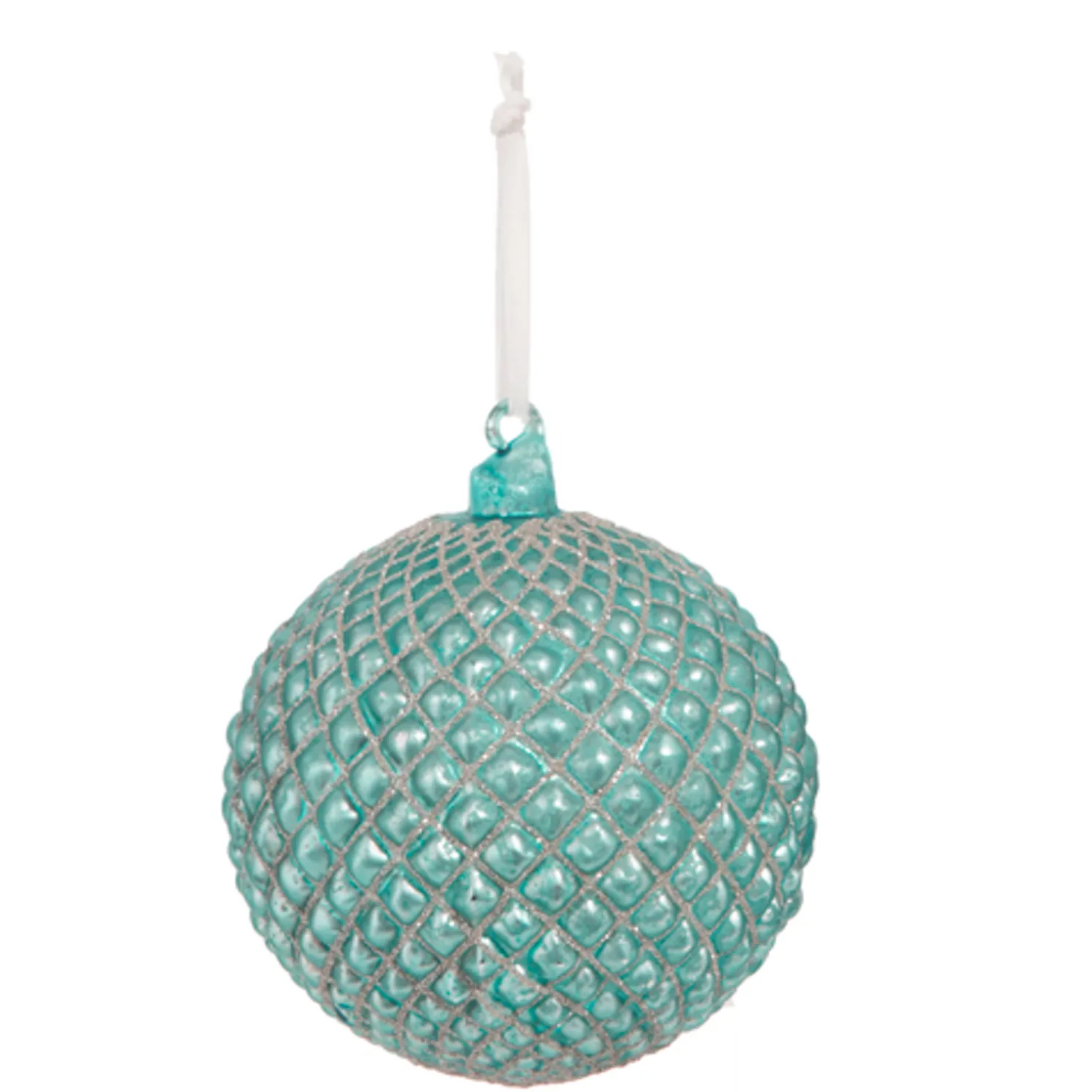 This stunning blue ornament features a unique quilted design with sparkling silver glitter in the grooves!Made by RazImports.Made of glass.Dimensions: 6″.
