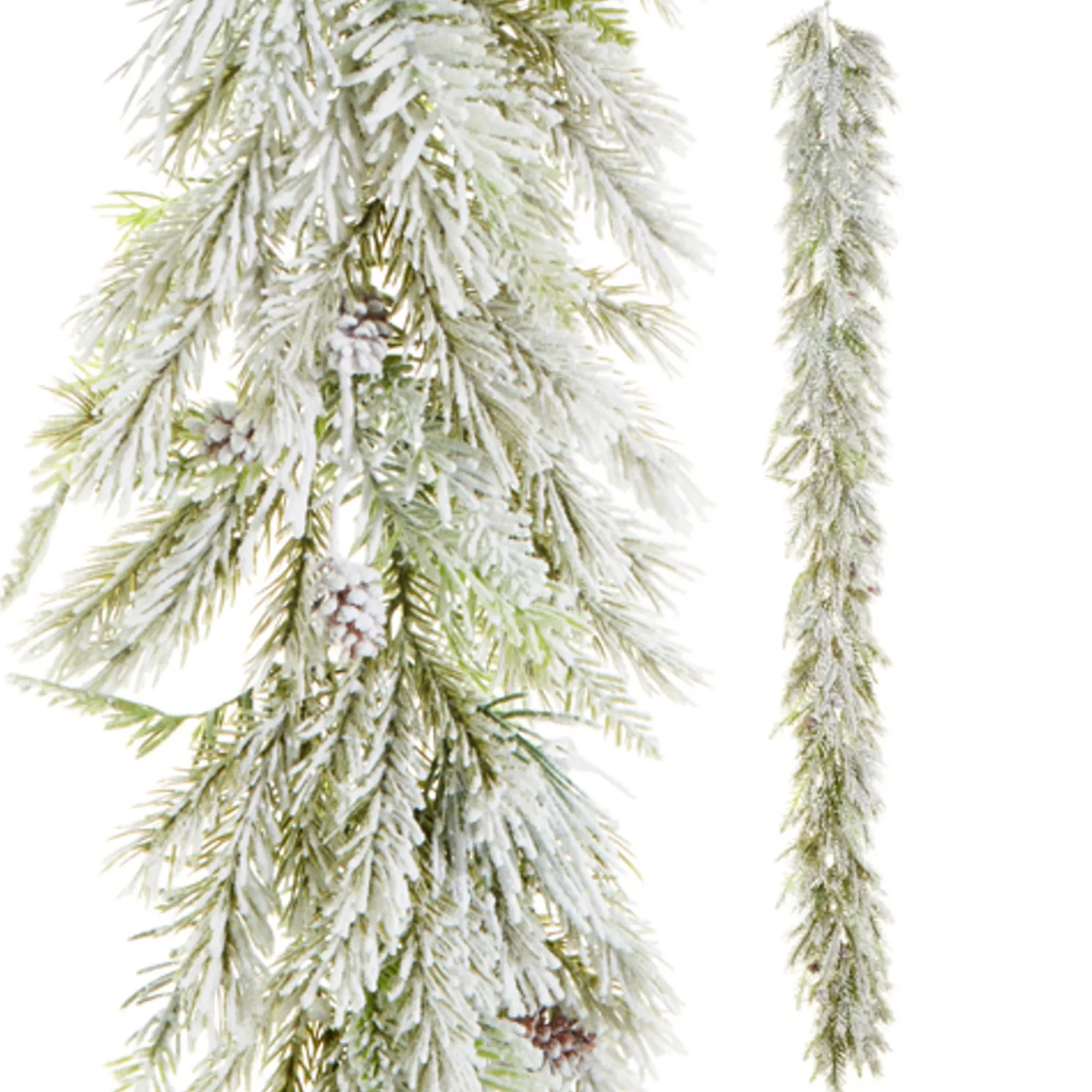 Decorate your mantle with this pretty green garland dusted with thick white snowfall and tiny pineconesdotted throughout!Made by Raz Imports.Made of plastic.Dimensions: 6′.