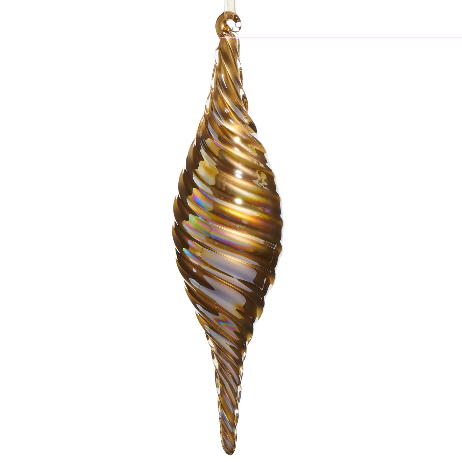 Swirls of intense gold make this glass finial a perfect Christmas ornament to add to your tree! The stunning iridescent tone gives it such a unique look!Made by Raz Imports.Made of glass.Dimensions:2.5″ D X 9.75″ H.