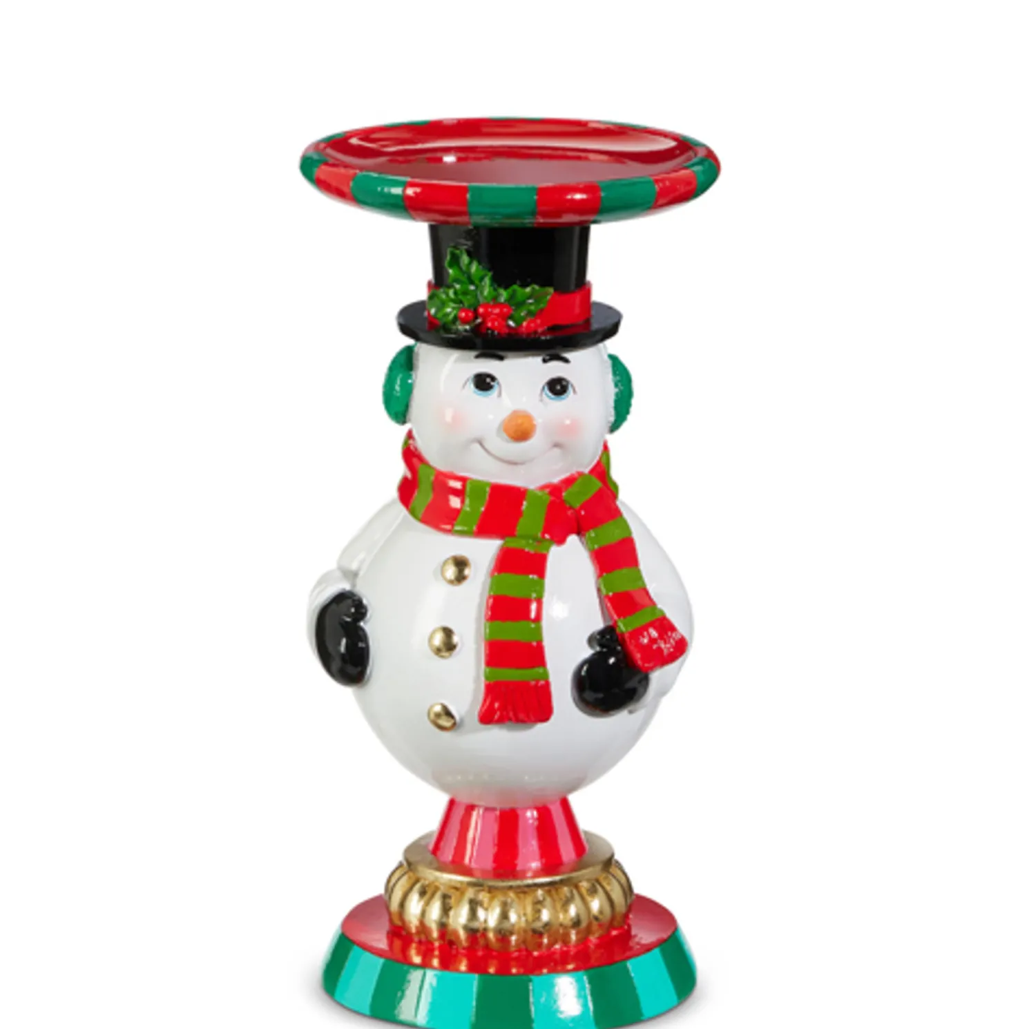Display your favorite flameless candle or small figure with these retro Christmas stands! Choose a sweet smiling snowman with bright blue eyes or Santa wearing his signature red suit and sparkling blue eyes! The pedestal top and base are painted with colorful stripes and gold accents!Each sold individually.Made by Raz Imports.Made of resin.Dimensions:4.5″ L X 4.25″ W X 9″ H.