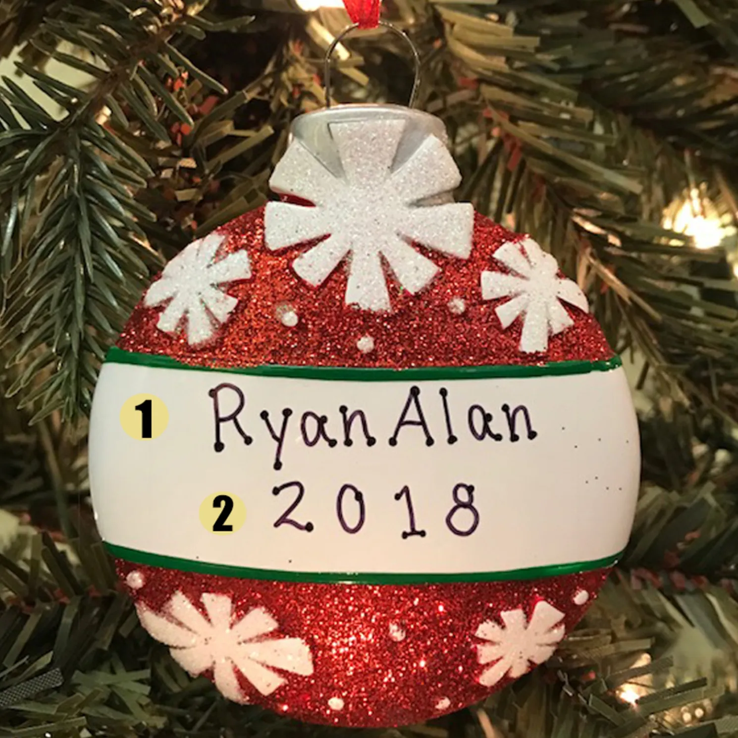 Give someone special this personalized Christmas ball ornament for the holidays this year. Beautifully decorated in red with glitter and snowflakes, this pretty ornament is sure to become a favorite for their tree. Made of resin. Dimensions 4″ x 4″ x 1/2″. Item # OR1434-A-2.No additional charge for personalization.